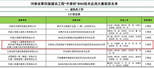 近日,由河南省住建廳指導(dǎo)、河南省建筑業(yè)協(xié)會(huì)主辦的河南省第四屆建設(shè)工程“中原杯”BIM技術(shù)應(yīng)用大賽獲獎(jiǎng)名單揭曉,經(jīng)過層層評(píng)審,由鄭州地產(chǎn)集團(tuán)投資管理有限公司主導(dǎo),上海建工二建集團(tuán)有限公司、機(jī)械工業(yè)第六設(shè)計(jì)研究院有限公司配合完成申報(bào)的河南省人民醫(yī)院地下智能停車及綜合開發(fā)建設(shè)項(xiàng)目BIM技術(shù)應(yīng)用榮獲建筑類綜合成果三等獎(jiǎng)。